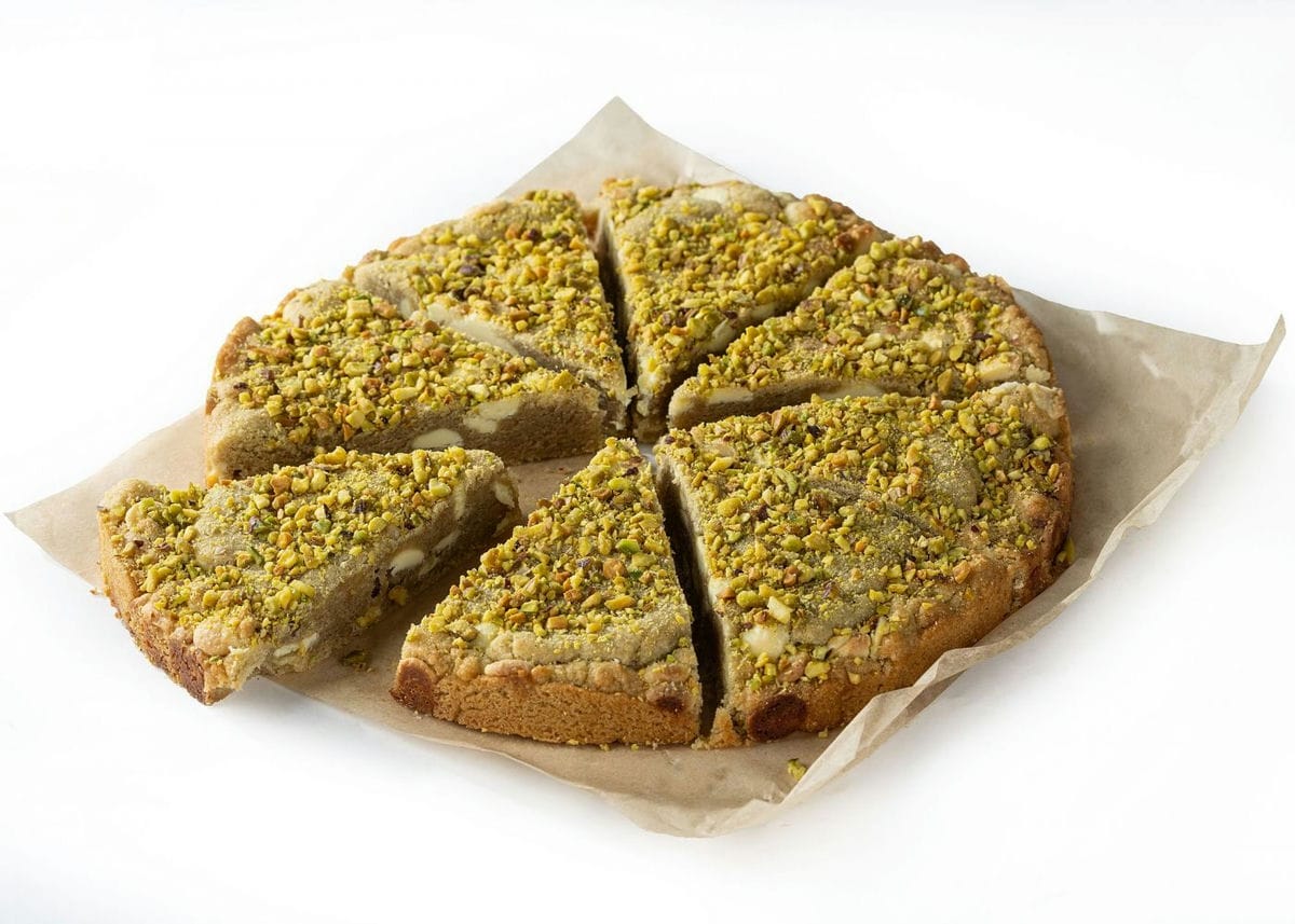 עוגייה מבצק פיסטוק עם שוקולד צ'יפס לבן מילוי פרלינים לבנים ומעל פיסטוק קלוי
